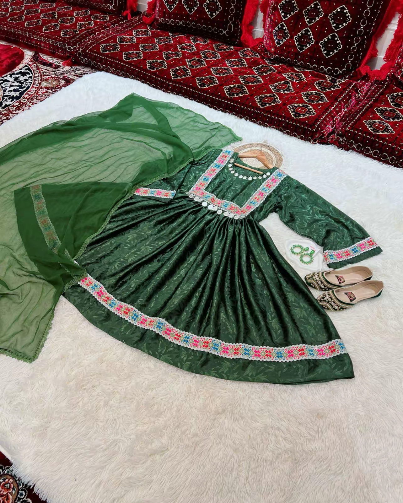 This dress comes as three pieces including a matching scarf and trousers.
