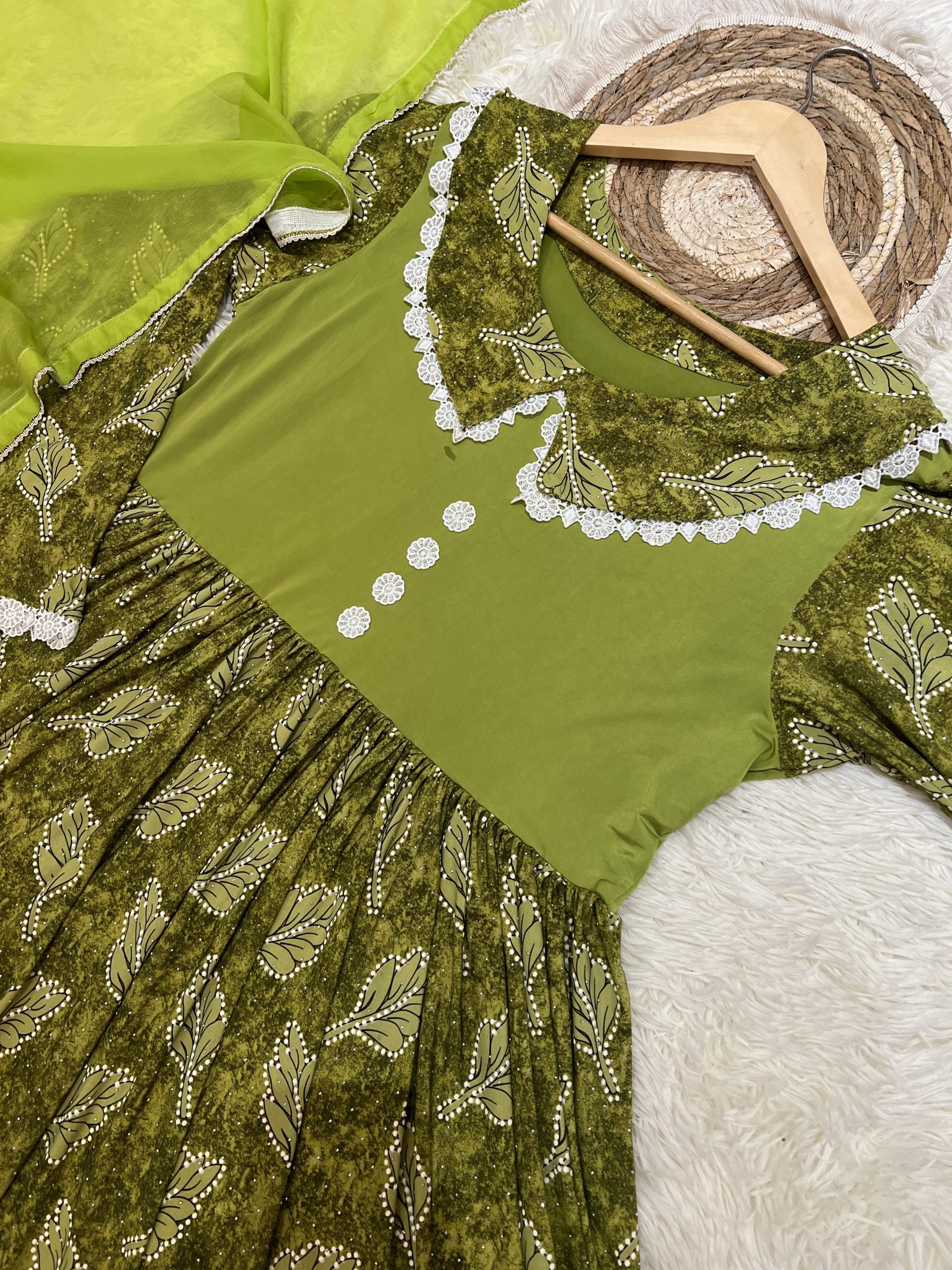 This dress comes as three pieces including a matching scarf and trousers.
